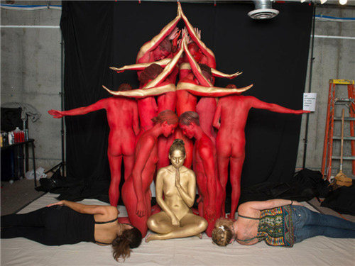 顶尖人体彩绘,人体模特组成寺庙景观