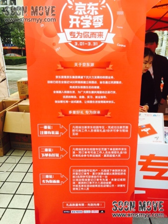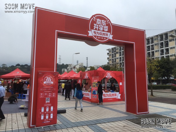 活动现场布置了五米多高的大型门头,气派而稳重,所谓高大上毫不夸张。门头一旁摆放五米长的京东开学季主题背景板,前面圆形展桌放满礼品,豪华大礼非轻便的折叠自行车莫属,当天下单最高者即可获取京东派送出的自行车一辆。门头后设立了一个认证注册互动区,由三块大型精美KT板制成,它是校园京东给同学们的一个平台基地,也是一个家。