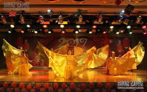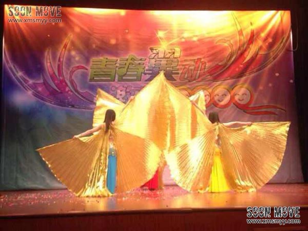 《金翅舞》:源于埃及神殿壁画女神,它的特点是舞者都配有一对金色大翅膀,轻盈而飘逸。时而像蜻蜓、蝴蝶般自由飞舞;时而如海浪层层涌动。金色代表着收获,翅膀代表着自由。金翅舞具有气势恢宏的大气效果,常用于大型舞台晚会演出,公司企业年会等。