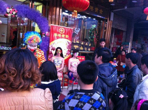 彩绘模特与小丑助阵造势下引来不少顾客