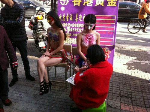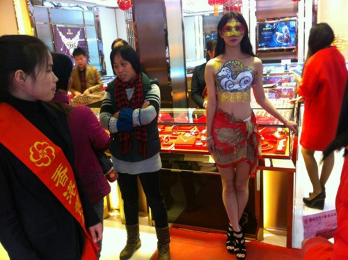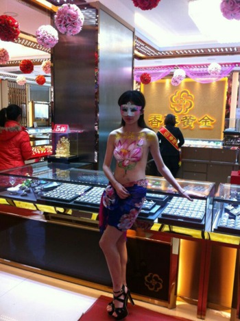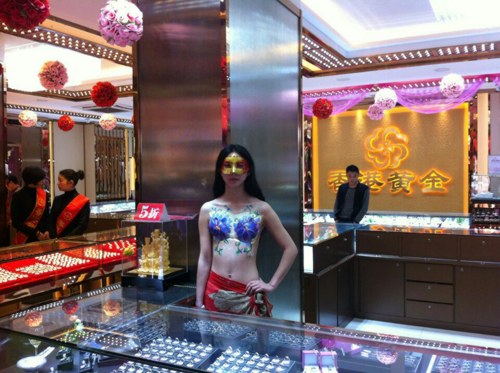 人体彩绘模特珠宝柜台前展示